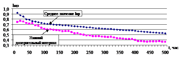 Рис.4. Построение нижнего доверительного интервала распределения интегрального показателя в зависимости от наработки.