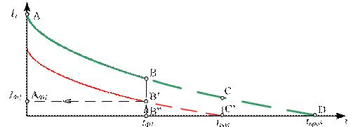 Участок В”D отражает остаточную работоспособность, при котором значение интегрального показателя достигает предельного значения, однако практическую оценку целесообразно проводить только до пересечения доверительного интервала до оси t (отрезок B”C’), отражающий гарантированный запас исправности объекта диагностирования.
