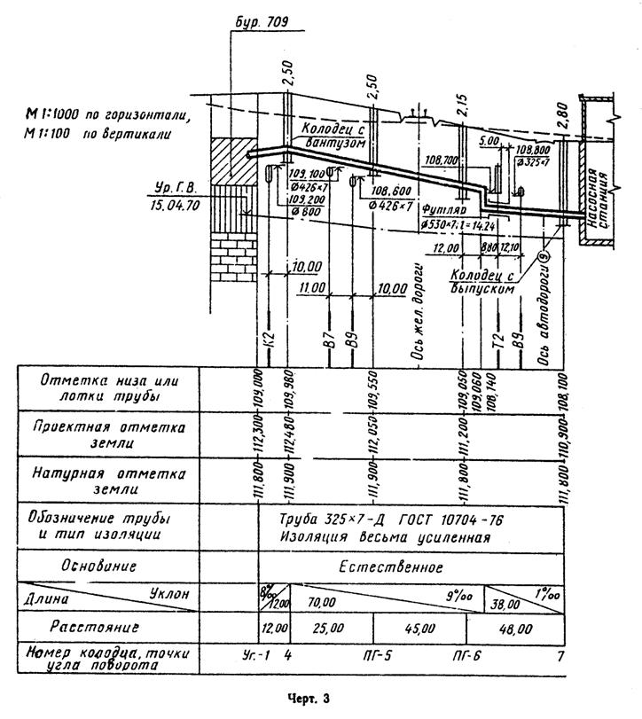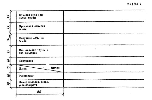 По полученным отметкам строится профиль канализационной сети. Оформление профиля регламентирует ГОСТ 21.604-82 (Форма 2, Чертёж 3).