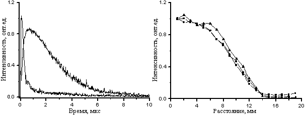 Рис. 2. Временные осциллограммы импульсов люминесценции распылительной плазмы металлического Cd для линий иона CdII с длинами волн 442 и 255.7 нм | Рис. 3. Пространственные распределения плотности возбужденных ионов CdII, излучающих на длинах волн: ■ – 325 нм; ▲ – 441.6 нм; · – 274,9 нм. По оси абсцисс отложено расстояние от поверхности мишени в мм |
