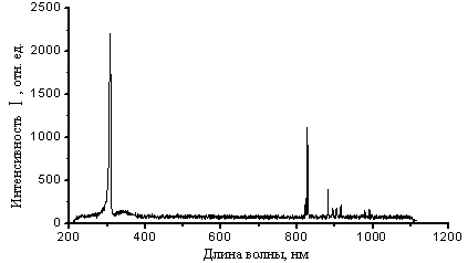 Спектральный состав излучения, возникающего в камере 1 при возбуждении газовой среды электронным пучком ускорителя «Арина-2», измерялся с помощью спектрометра с ПЗС-матрицей МAYA-2000Pro. Световое излучение выводилось из камеры 1 на входную щель с помощью кварцевого световода и специальной согласующей линзы. Измеряемый спектральный диапазон длин волн – 200÷1200 нм.