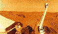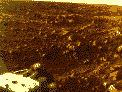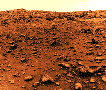 | На первой цветной фотографии марсианской поверхности, полученной "Викингом-1", хорошо виден охристо-красный материал, покрывающий большую часть поверхности подложки из более темных пород, проступающей местами (внизу справа). Красноватый материал может быть лимонитом (гидратированная окись железа). Подобные породы на Земле возникают под воздействием воды и окислительных процессов. Марсианское небо имеет красноватый оттенок. |