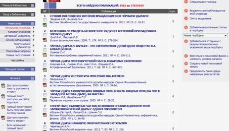 На рис. 50 представлен пример поискового запроса публикаций по словосочетанию «черные дыры» (данное словосочетание мы ищем в названии журнальных статей, в их полных текстах). Поиск производится по публикациям, имеющим полный текст на сайте НЭБ, нас интересуют статьи, опубликованные с 2005 по 2013 год. Список полученных результатов будет отсортирован в порядке убывания релевантности.