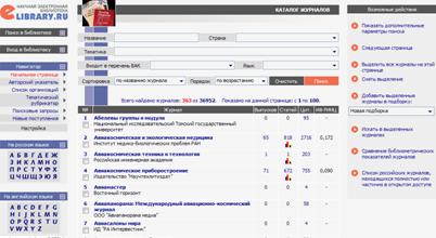 После выделения раздела «Каталог журналов» поиск по списку журналов можно осуществлять, используя буквы русского и латинского алфавита, расположенные в левой части раздела (рис. 51). Выбрав определенную букву, переходите на раздел каталога, содержащий источники, начинающиеся с этой буквы алфавита.