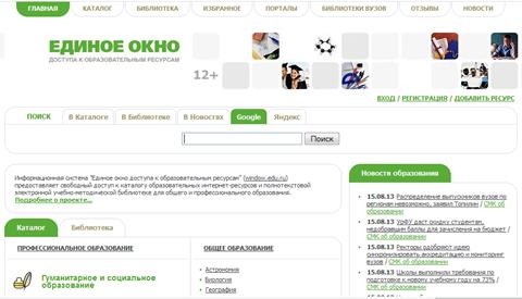 Информационная система "Единое окно доступа к образовательным ресурсам" предоставляет свободный доступ к каталогу образовательных интернет-ресурсов и полнотекстовой электронной учебно-методической библиотеке для общего и профессионального образования (рис. 54).