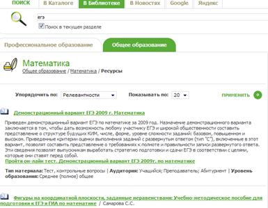 В разделе «Библиотека» представлено более 28 тыс. учебно-методических материалов, разработанных и накопленных в системе федеральных образовательных порталов, а также изданных в университетах, ВУЗах и школах России.