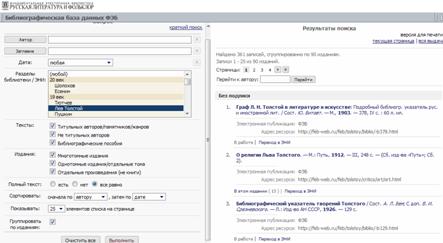 В Библиографической базе данных (ББД) через расширенный поиск необходимо выбрать раздел библиотеки. Список найденных документов отображается в правой части окна "Библиографическая база данных ФЭБ" (рис. 59).