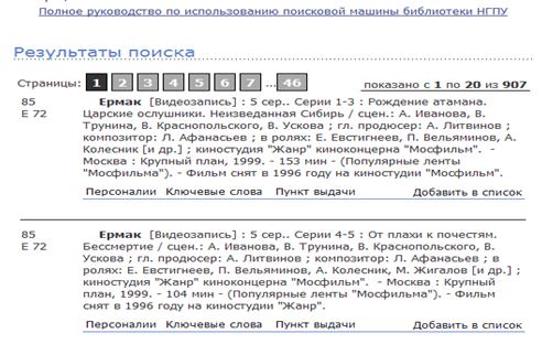 Более подробная информация по поиску, отбору информации указана в Руководстве по использованию поисковой машины библиотеки НГПУ.
