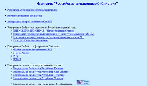 http://www. / – Российский информационно-библиотечный консорциум (РИБК). Возможность поиска библиографических данных и полнотекстовых ресурсов в электронных каталогах пяти крупнейших библиотек России: ВГБИЛ, НБ МГУ, Парламентская библиотека, РГБ, РНБ. Портал открыт для всех пользователей сети Интернет.