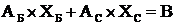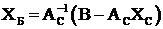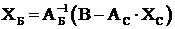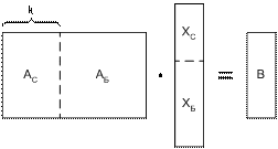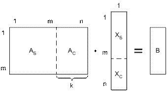 Если матрица А условий задачи состоит из линейно независимых уравнений, то её ранг r(A)=m. Расширенная матрица В получается из А добавлением столбца правых частей вi. При r(A) = r(B) система совместна и имеет бесконечное множество решений. Найти решения можно, если матрицу А разделить на блоки, выделив базисный минор АБ, и оставшийся блок АС. Соответственно делится и вектор Х на базисные ХБ и свободные ХС переменные (рис. 2.1).