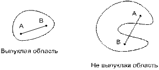 . Геометрическим местом точек хi, являющихся решением уравнения, будет некая гиперплоскость, вырождающаяся при n = 2 в прямую, а при n = 3 в плоскость. Эта гиперплоскость делит пространство на два полупространства. Решением системы неравенств является пересечение полупространств, образующее выпуклую область. Выпуклая область – такая область, в которой для двух точек, принадлежащих области, отрезок, их соединяющий, полностью принадлежит ей (рис. 2.2).