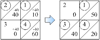 Перераспределение по всем клеткам цепочки проводится на одинаковую величину, а объем перераспределения определяется минимальной поставкой в клетке, где поставки уменьшаются. Очевидно после перераспределения там окажется 0. В нашем случае уменьшаются поставки в клетках 2/40 и 4/60. Следовательно, объем перераспределения поставок – 40 т (рис. 2.15). Целевая функция при этом изменится на