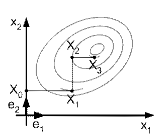 Достоинство метода: простой алгоритм, по которому на каждом этапе производится оптимизация только по одной переменой при фиксированных значениях остальных. При этом могут использоваться различные методы одномерной оптимизации по одной переменной, в том числе и метод перебора.