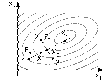 По мере приближения к оптимуму появляется необходимость уменьшать размер многогранника, сжимая его в 2 раза относительно вершины, в которой отмечено минимальное значение функции.