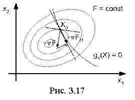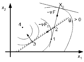 Некоторые особенности и сложности реализации качественно были рассмотрены (см. рис. 3.20). Здесь направление градиента реализуется только в допустимой области. При выходе траектории на активные ограничения осуществляется переход на проекцию градиента. При движении по границе необходима проверка условия схода с границы в допустимую область. Разработано много подобных методов, наиболее полно представленных в [4].