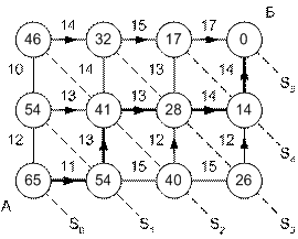 Оптимизацию начнём с последнего пятого шага (рис. 4.2). Рассмотрим все возможные состояния, а их два, в начале шага, и для каждого выберем оптимальное управление, ведущее в конечный пункт. Управления здесь выбираются однозначно и запоминаются. Эффект на шаге определяется длиной пути и также запоминается как характеристика соответствующего состояния. На рис. 4.2 оптимальные управления отмечены стрелками, а условно оптимальные эффективности вписаны в кружки.