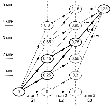Решение начинаем с разделения операции на этапы. В качестве этапа принимается вложение в конкретный банк, т. е. операция искусственно разбивается на три этапа.