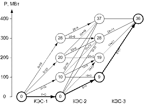 По оптимальной схеме на КЭС-2 вводится 100 МВт и на КЭС-3 вводится 300 МВт, с общими капитальными вложениями К = 36 о. е.
