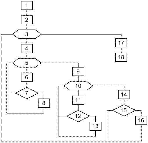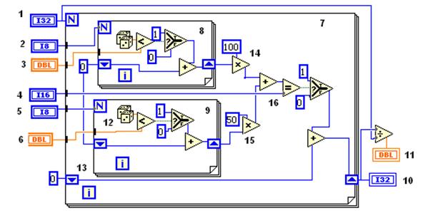 На рис. 6.4 приведена диаграмма, реализующая рассмотренный алгоритм в среде программирования LabVIEW. На диаграмме показаны три цикла: 7 – внешний по числу испытаний, и два внутренних 8 и 9, соответственно, по блокам 100 и 50 МВт.