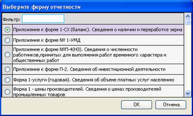 Выбранную форму отчетности (выбранная строка с наименованием формы отмечается другим цветом) можно открыть, нажав кнопку «ОK». Для отмены выбора формы предусмотрена кнопка «Отмена».