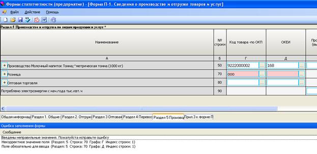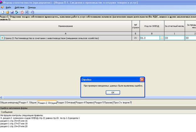 . Если в отчете будут обнаружены ошибки, система сообщит об этом и выведет их в нижней части окна, с указанием: раздела, строки, графы, индекса, а так же будут указаны типы ошибок.