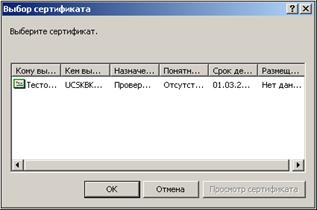 Заполненный в электронной форме отчет перед отправкой в КРАСНОДАРСТАТ должен быть заверен ЭЦП предприятия. На экране отобразится окно выбора сертификата. Список сертификатов отображает все сертификаты, установленные в Системное хранилище сертификатов в папку «Личные». В списке следует выбрать сертификат ЭЦП, аналогичный загруженному в КРАСНОДАРСТАТ при регистрации, и нажать кнопку «ОК».