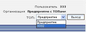 2) На странице авторизации ввести логин и пароль в поля «Пользователь» и «Пароль». Нажать кнопку «Вход». На экране появится Главная страница Основного окна системы, в правом углу которого будут указаны имя пользователя, название организации и списочное поле ТОП, из выпадающего списка которого можно выбрать Предприятие или один из ТОП (см. рисунок ниже).