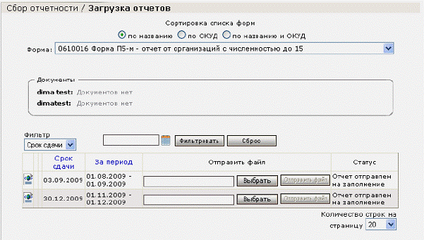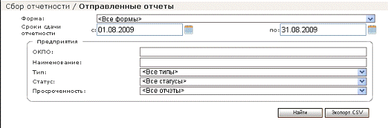 − контрольный период, за который необходимо просмотреть список отправленных отчетов (поля Сроки сдачи отчетности с…по);