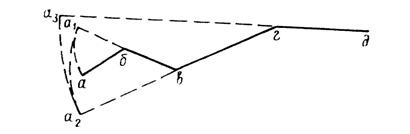 Измерение ломаных отрезков производят по частям или путем их последовательного спрямления (способ наращивания). При этом способе (рис. 11) устанавливают ножки измерителя в точках а и б, совмещают край линейки с направлением б–в, вращают измеритель вокруг ножки в точке б и устанавливают вторую ножку измерителя у края линейки в точке а1, т. е. на продолжении отрезка бв. После этого перемещают ножку циркуля из точки б в точку в и получают сумму отрезков аб и бв. Действуя аналогично, получают в растворе циркуля а3д общую длину ломаной линии абвгд.