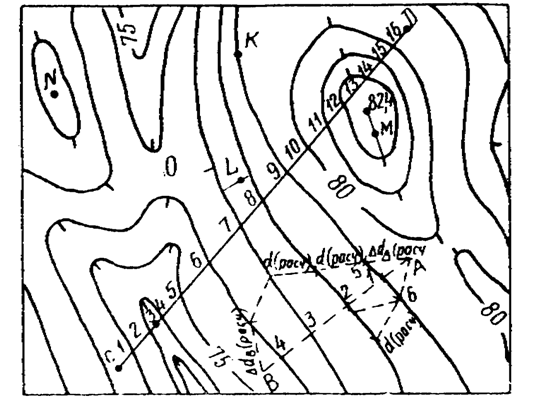 Суть задачи: между точками А и В требуется проложить (см. рис. 28) трассу по кратчайшему направлению, но так, чтобы уклон на любом участке трассы был не более некоторого расчетного уклона.