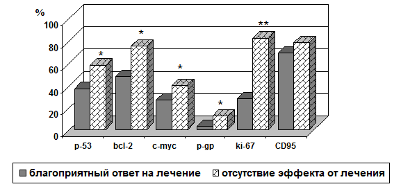В группе больных лимфомами с хорошим ответом на лечение уровень экспрессии р-53, bcl-2, c-myc, ki-67, р-гликопротеина (p-gp) был ниже, чем в группе пациентов с отсутствием эффекта от проводимой терапии: р-53 ниже - в 2 раза (28,6% в группе больных с хорошим ответом на терапию против 58,1% в группе больных с отсутствием эффекта; р<0,05), маркер пролиферативной активности ki-67 – в 3 раза (28,6% в группе с хорошим ответом на терапию против 77,4% в группе с отсутствием ответа на терапию; р<0,03), онкопротеина c-myc - в 2 раза (23,8% против 41,9%; р<0,05, соответственно) и bcl-2 – в 2 раза (42,9% в группе с хорошим ответом на терапию против 71,0% в группе с отсутствием ответа на терапию; р<0,05), также маркер множественной лекарственной устойчивости p-gp – в 2 раза (9,5% против 19,4%; р<0,05, соответственно). Уровень экспрессии рецепторной молекулы CD95 достоверно не различался в зависимости от ответа на терапию и составил (57,1% в группе с хорошим ответом на терапию против 67,7% в группе пациентов, у которых эффект от терапии отсутствовал) (рис.1).