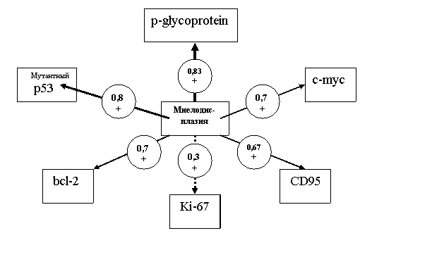 Предпринят математический поиск взаимосвязи между степенью выраженностью миелодисплазии и отдельными маркерами. Для этого использовался корреляционный анализ между переменными по принципу формирования парных значений, которые образуются из рассматриваемых зависимых выборок. Для оценки факта наличия корреляционных связей, их силы и направленности был использован коэффициент корреляции Пирсона. Математический анализ выявил, что корреляционная связь между признаками действительно существует. Выраженность миелодисплазии (процентное отношение дисплазированных элементов костного мозга) хорошо коррелировала с пятью из шести показателей. Наиболее сильная прямая связь индекса была выявлена с p-гликопротеином (коэффициент Пирсона равен (+)0,83) и мутантной формой p53 (+) 0,8. Остальные признаки демонстрировали среднюю и слабую корреляцию: CD95 (+) 0,67, с-myc (