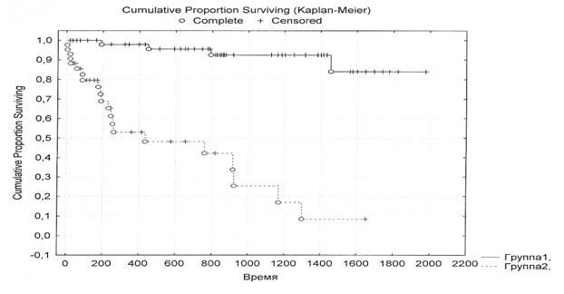 Рис.3. Выживаемость больных гемобластозами за период наблюдения гг. (1 группа –,0%) больных без признаков миелодисплазии на этапе диагностики основного заболевания, 2 группа -,0%) пациентов с наличием диспластических изменений в костном мозге).