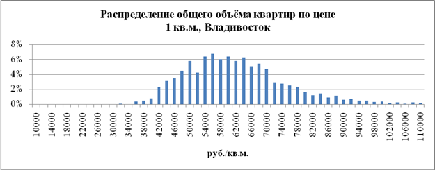 Рисунок №1. Распределение общего объема квартир по стоимости 1 кв. м., (руб.)