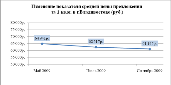 К концу сентября 2009г. показатель средний цены предложения на вторичном рынке многоквартирного жилья г. Владивостока был зафиксирован на уровне 61 145 руб./кв. м., что на 0,6% ниже по сравнению с аналогом в августе месяце (373 руб./кв. м. в денежном выражении).