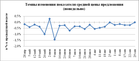 Из-за резкого снижения цен в прошлом месяце квартир гостиничного типа средняя цена предложения на них в сентябре значительно увеличилась на 1,9%руб./кв. м. в денежном эквиваленте).