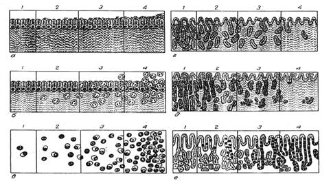 Рис. 1. Визуально-аналоговая шкала для оценки выраженности морфологических изменений слизистой оболочки желудка: 1 – норма, 2 – слабые, 3 – умеренные, 4 – выраженные изменения; а - Helicobacter pylori, б – нейтрофилы, в – мононуклеарные клетки, г- атрофия в антруме, д – атрофия в теле желудка, е – кишечная метаплазия.