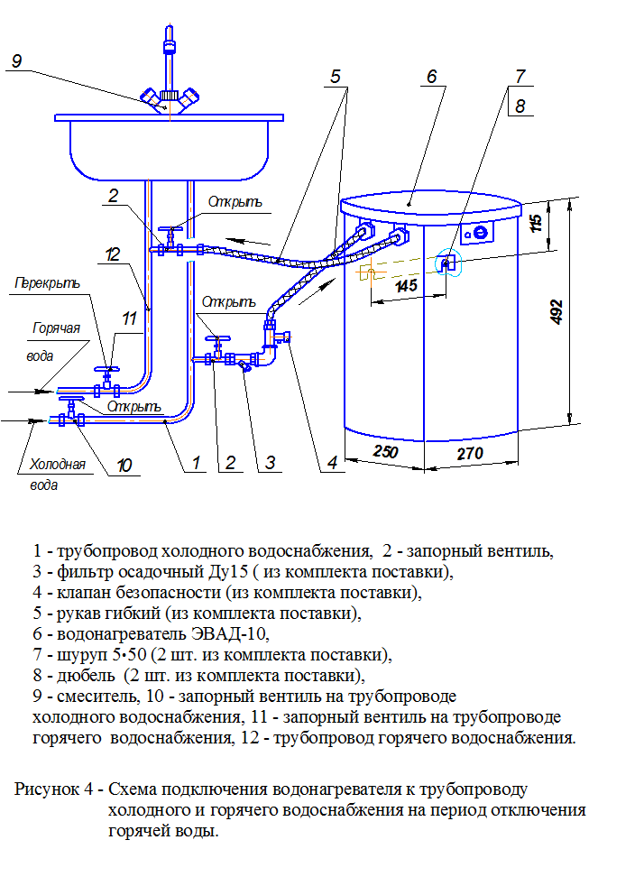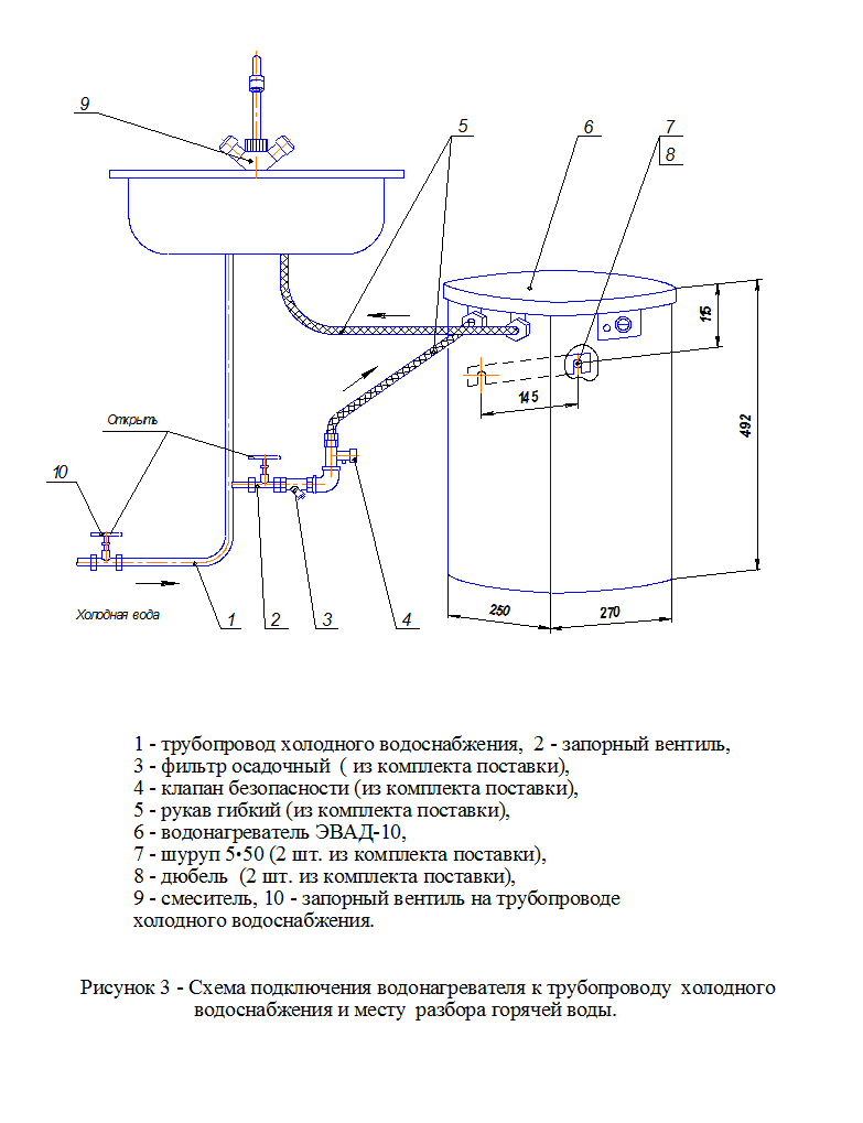- при подключении водонагревателя по схеме, показанной на рисунке 1, необходимо открыть вентиль разбора горячей воды затем вентили 2, 10.