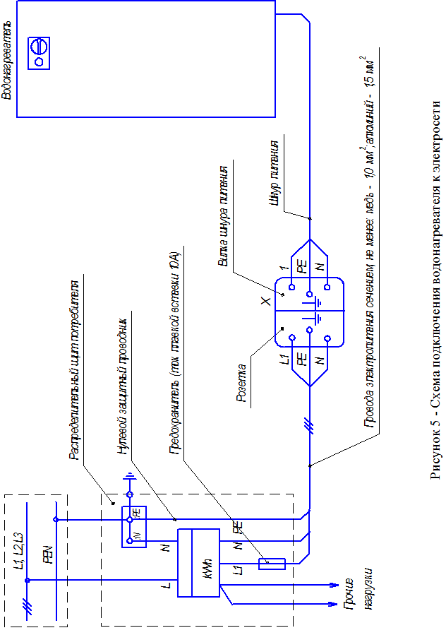 На распределительном щите установить аппарат защиты электрических цепей водонагревателей (предохранитель, или автоматический выключатель) на номинальный ток 10А. Предохранитель установить в фазном проводнике. Установка предохранителя в нулевом рабочем проводнике ЗАПРЕЩАЕТСЯ. Аппарат защиты цепей водонагревателей допускается не устанавливать, если питающая их линия защищена аппаратом с уставкой не более 25А.