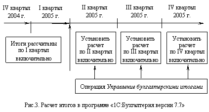 Условия выведения итоговой информации. Успешная работа в программе «1С: Бухгалтерия версии 7.7» по формированию проводок и подведению бухгалтерских итогов обеспечивается возможностью управления расчетом итогов за определенный период времени. В программе этим периодом является квартал. Если расчет за квартал установлен, то и итоговая информация может формироваться за любой предыдущий период времени до последнего дня установленного отчетного периода.