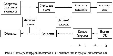 Любой стандартный отчет в печатной форме имеет два управляющих элемента: Обновить и Настройка. Управляющий элемент Обновить служит для обновления отчета новыми данными после исправления ошибки в документах и операциях, ее породивших. Для быстрого устранения обнаруженных ошибок в программе предусмотрен режим расшифровки (детализации) итоговой информации одних отчетов через другие, более подробные, вплоть до документа, на основании которого была сформирована данная итоговая информация.
