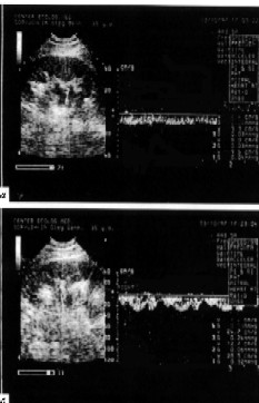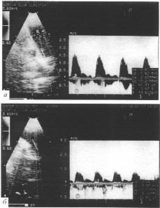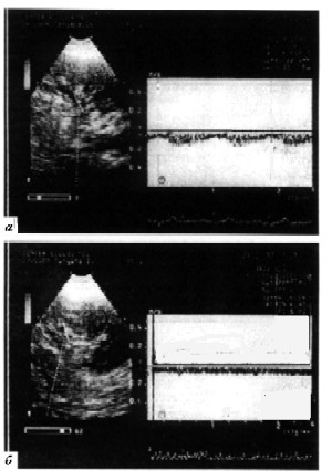 Рисунок 18. Кровоток в почечной вене у больной пиелонефритом во время пробы с произвольной задержкой мочи а - в момент задержки мочи, б - после опорожнения мочевого пузыря.