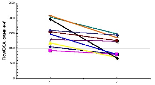 Flow см/ мин | 10,0±0,6 | 10,0±0,7 | нд | 10,9±0,6 | нд |