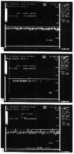 Следует заметить, что сейчас достаточно известны внутрипочечные механизмы изменений этих характеристик артериального кровотока. Так эти параметры достоверно меняются при кистах почечного синуса и гидронефрозах ( 1995). Нарастание показателей активности мышечной стенки артерий почек наблюдается при остром гломерулонефрите и активизации хронического гломерулонефрита, при острой и хронической почечной недостаточности (, 1992, с сотр. 1994, с сотр. 1995); при отторжении пересаженной почки (de Gaetano A. M. et al. 1989, с сотр. 1994, с сотр. 1994); при диабетической нефроангиопатии ( с сотр. 1995); при почечной колике, особенно при проксимальной обструкции мочеточника и признаках пиелонефрита (de Toledo L. S. et al. 1996). Повышение тонуса резистивных сосудов почек вызывает также эссенциальная артериальная гипертензия (Jensen G. et al. 1994, , 1995). При этом некоторая противоречивость публикуемых результатов может объясняться механизмами наступающих изменений. Дело в том, что в разгаре патологического процесса в почках наблюдается усиление кровотока через юкстамедуллярные клубочки при частичном прекращении функционирования пути крови через кору. В этот период отмечается снижение PI и RI. Более тяжелые поражения, когда изменениям подвергаются и юкстагломерулярный аппарат, шунтирование через него крови становится невозможным, PI и RI вновь возрастают. Последнее наблюдается при необратимых поражениях почечных гломерул ( 1996). При стенозировании почечных артерий PI и RI бывают ниже нормы (Veglio F. et al. 1995, с сотр. 1997).