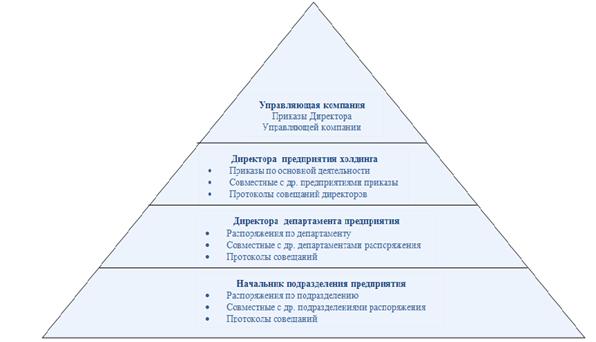 Рис. 11. Примерная схема издаваемых в холдинге распорядительных документов в соответствии с различными иерархическими уровнями управления.