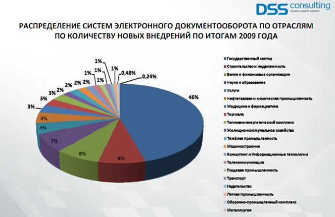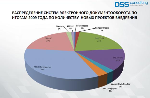 Представленные аналитической компанией DSS Consulting данные, конечно, позволяют говорить о некой условной востребованности той или иной информационной системы для автоматизации документооборота, но всей полноты картины относительно сложности реализованных проектов, области автоматизации в каждом конкретном случае, количества автоматизированных процессов, созданных пользовательских рабочих мест, и так далее, не дают.