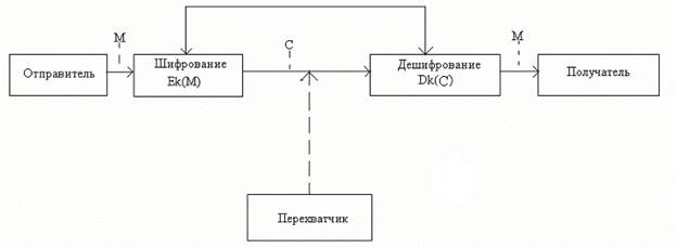 Использование криптографических преобразований позволяет скрыть защищаемую информацию M путем перевода ее в нечитаемый вид C. При этом, чтение информации возможно только после дешифрования сообщения С на секретном ключе K, известном легальным пользователям и неизвестном злоумышленнику. Стойкость криптографических преобразований основана только на секретности ключа дешифрования K.