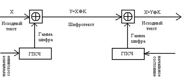 Принцип шифрования заключается в формировании генератором псевдослучайных чисел (ГПСЧ) гаммы шифра и наложении этой гаммы на открытые данные обратимым образом, например, путем сложения по модулю два. Процесс дешифрования данных сводится к повторной генерации гаммы шифра и наложении гаммы на зашифрованные данные. Ключом шифрования в данном случае является начальное состояние генератора псевдослучайных чисел. При одном и том же начальном состоянии ГПСЧ будет формировать одни и те же псевдослучайные последовательности.