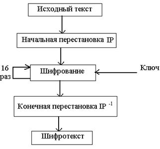 Алгоритм, изложенный в стандарте DES (Data Encryption Standard), широко применялся до 2002 года для шифрования данных в США [11]. Он был разработан фирмой IBM для собственных целей, но после был рекомендован к применению в качестве федерального стандарта шифрования. Алгоритм DES не является закрытым и был опубликован для широкого ознакомления. Алгоритм предназначен для шифровки и расшифровки блоков данных длиной по 64 бита под управлением 64-битового ключа, в котором значащими являются 56 бит. Дешифрование в DES выполняется путем повторения операций шифрования в обратной последовательности.