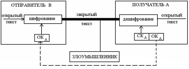 В данной схеме участвует получатель секретного сообщения А и отправитель секретного сообщения B. ОКА – открытый ключ пользователя А, СКА – секретный ключ пользователя А. Ключевая пара (ОКА, СКА) сгенерирована на стороне получателя А, после чего открытый ключ данной пары ОКА отправляется по открытому каналу пользователю B. Предполагается, что злоумышленнику также известен открытый ключ ОКА.